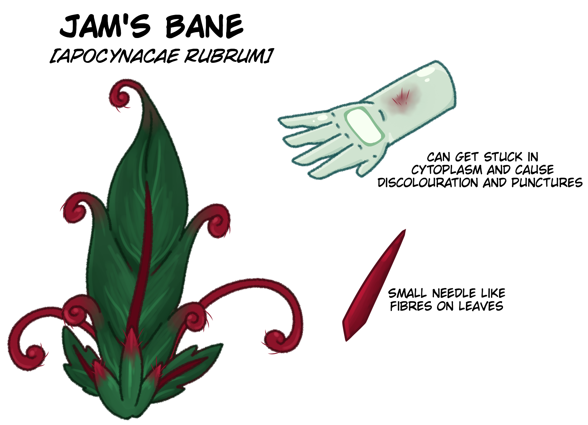 It's leaves are covered in small needle like fibres, which secret a chemical which is used to break down and absorb bugs, however if stuck in the cytoplasm of a Jammyx it can cause degradation of the cytoplasm's outermost layer, usually resulting in red discolouration and small punctures. Usually a Jammyx recovers from the punctures within a matter of days, though some have reported being left with cracked cytoplasm in affected spots.